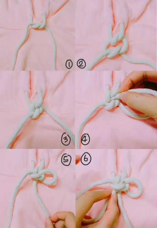 打两个结,再跟着图片的步骤,将两端穿入中间的结,根据帽绳的长度做出几个花瓣的形状,最后进行整理微调。(其实诀窍就是不断往中间的结里灌绳子)