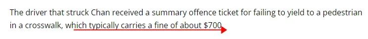 据报道,撞上Suete Chan的司机是一名41岁的女子,她因没有在人行道上给行人让路而被开出简易违章罚单,罚款通常为$700加元左右。