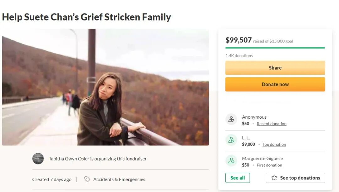 Suete Chan是家里的独生女。现在,她居住在香港的父母需要远赴加拿大为爱女办理身后事,但是所需开支庞大,于是在GoFundMe发起众筹,以协助家人到加拿大奔丧及要负担检疫隔离等高昂费用。