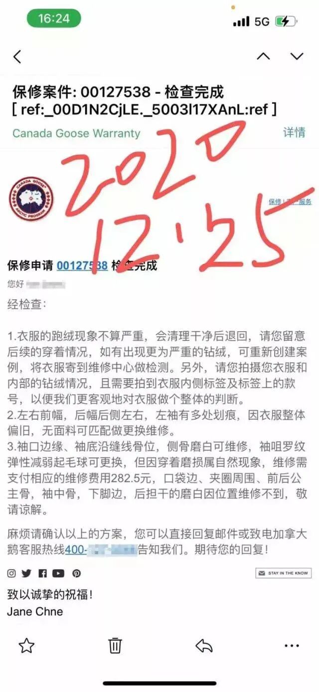 第二年穿时却发现跑绒了,于是她申请了加拿大鹅的了“全球终身保修”服务,并把衣服寄到保修点进行维修。