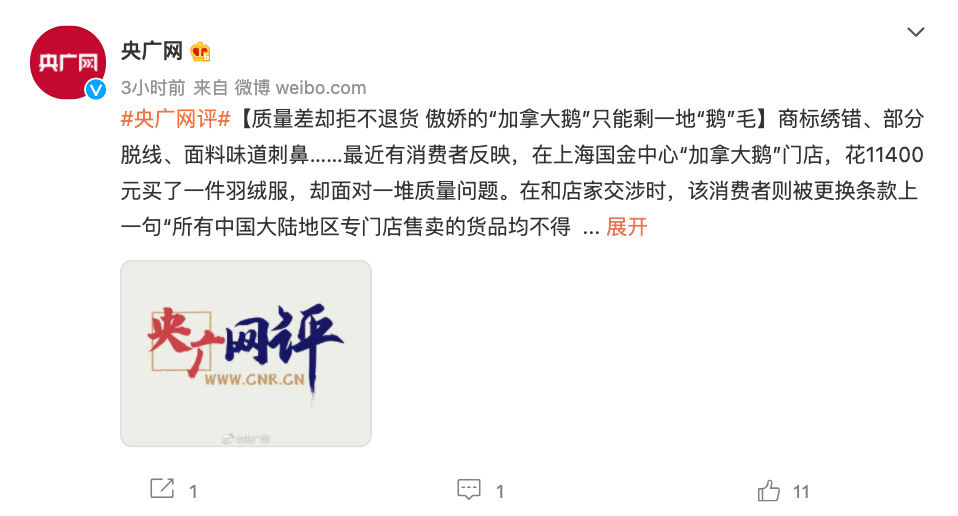 骂上热搜!加拿大鹅「中国大陆门店不得退货」被约谈后回应!11400元买的「加拿大鹅」商标绣错、缝线粗糙,面料刺鼻…