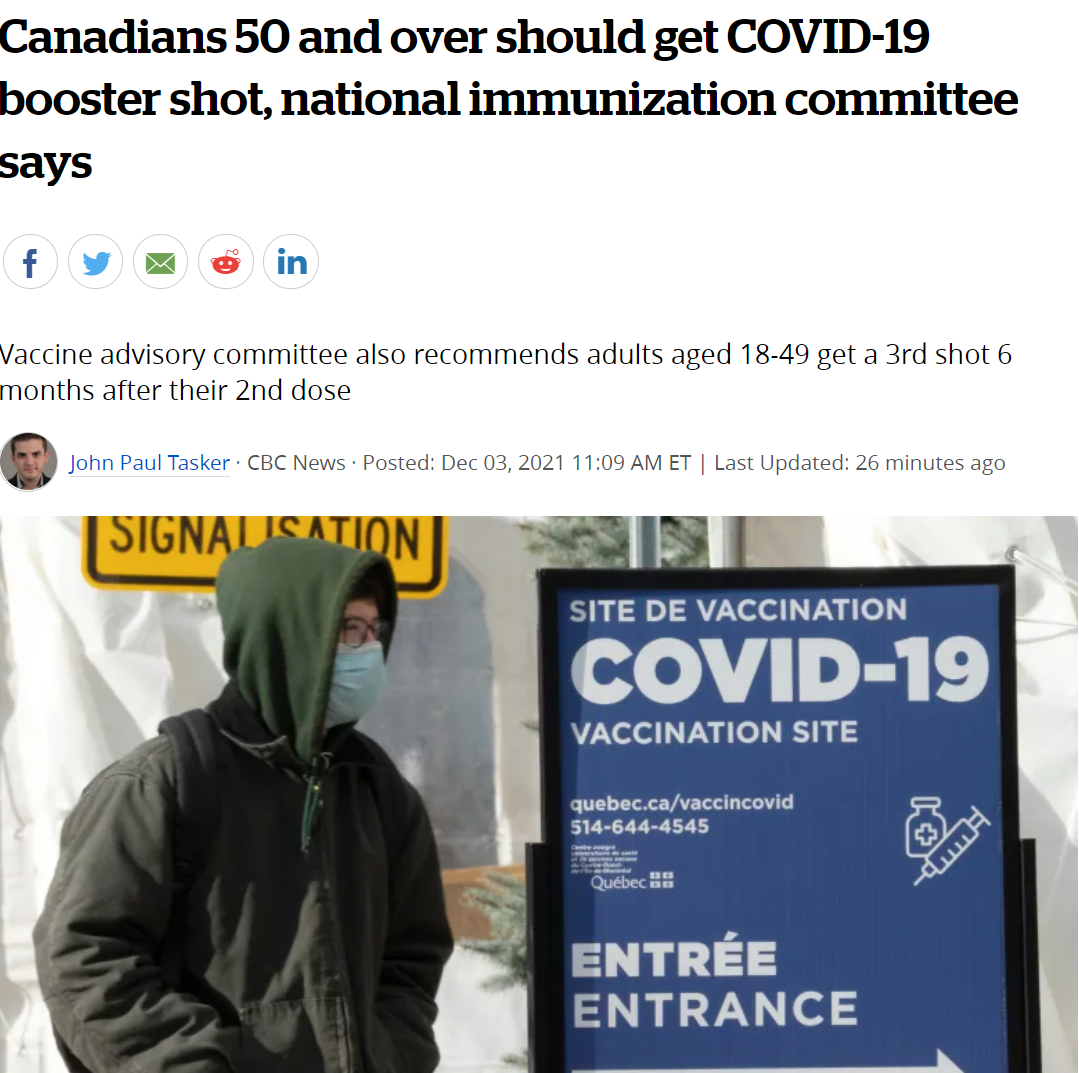 “强烈建议”所有50岁以上的加拿大国民注射加强针,另呼吁18-49岁的成年人在第二针打完6个月后接种第3针。