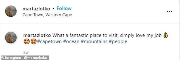 3周前,玛塔在社交媒体上发出了几张南非Table山的风景照以及一张在飞机里拍摄的俯瞰图,