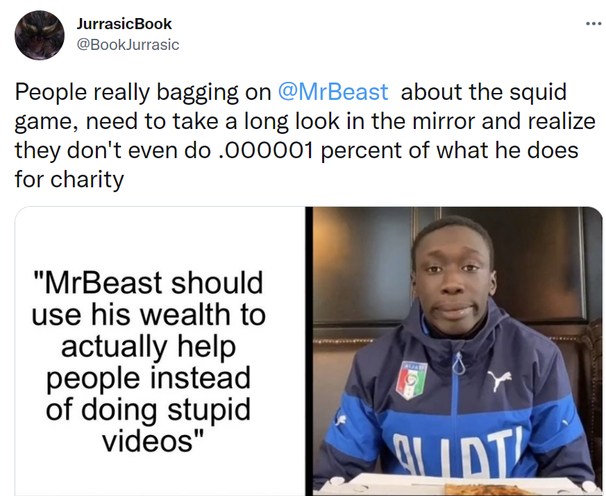 抨击 @MrBeast 的人,需要照照镜子。@MrBeast为慈善做了这么多,他们连他的0.000001%都做不到。