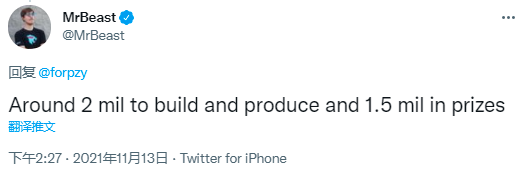 而Mr Beast 则一共花了350万美元,其中200万美元用于还原场景和制作道具,150万美元作为奖金,真是大手笔啊!