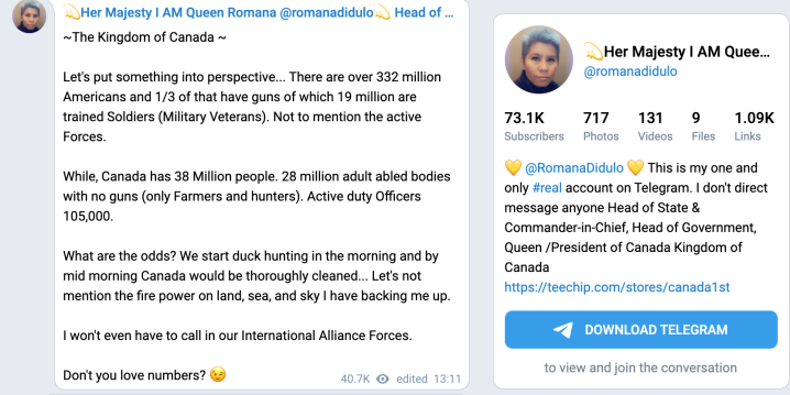 这位自称为“加拿大新女王”的女子叫罗曼娜·迪杜洛 (Romana Didulo),在油管上宣称: