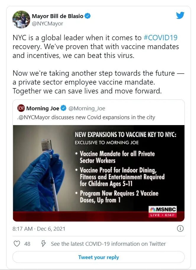 该市所有18.4万家私营企业都将接受疫苗接种要求。