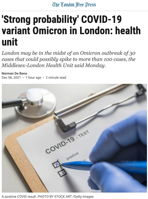 安省伦敦卫生局(Middlesex-London Health Unit)虽然仍在等待最终数据,但表示,这宗至少30例的Omicron集群传播可能性非常高(very high)。