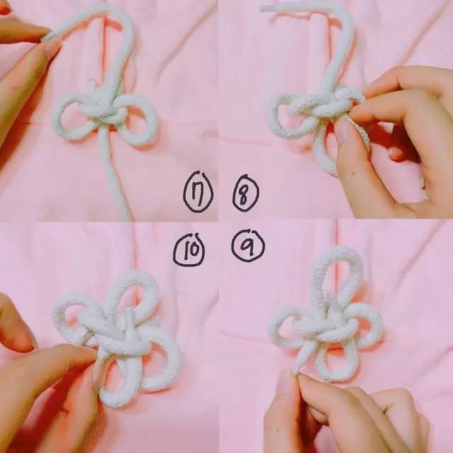 打两个结,再跟着图片的步骤,将两端穿入中间的结,根据帽绳的长度做出几个花瓣的形状,最后进行整理微调。(其实诀窍就是不断往中间的结里灌绳子)