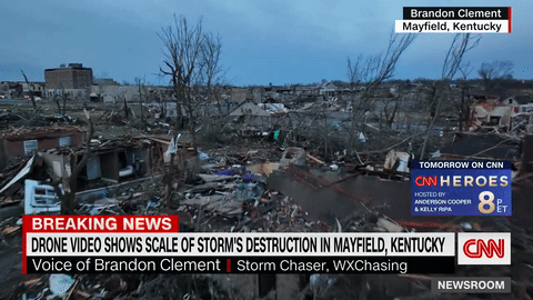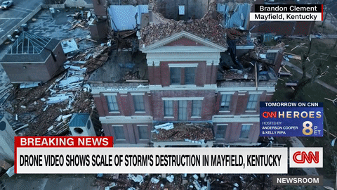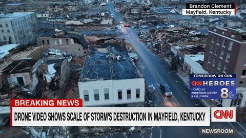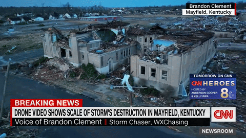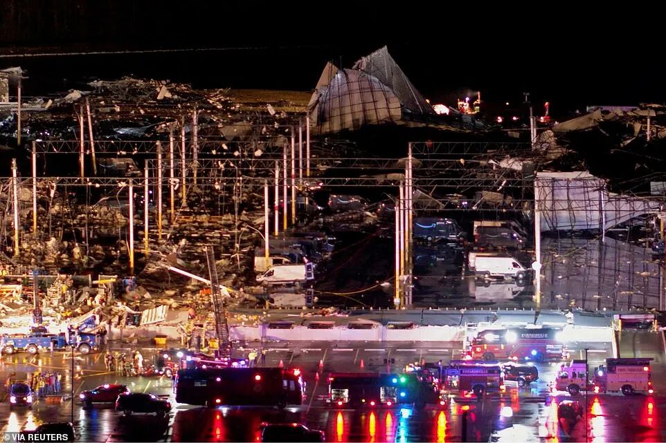 在受损最严重的梅菲尔德镇,龙卷风袭击该地区时,至少110人挤在一家蜡烛工厂内。