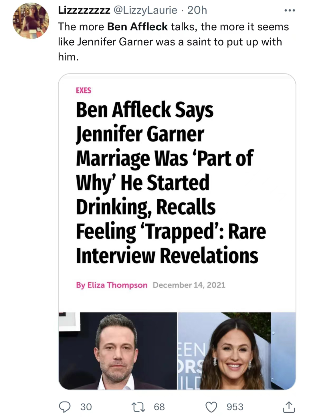 这近一年来,一直跟天后詹妮弗·洛佩兹爱得昏天黑地的“蝙蝠侠”大本Ben Affleck在接受采访时,竟然破天荒地提起了自己的上一段婚姻,以及开始公开diss起前妻詹妮佛·加纳......