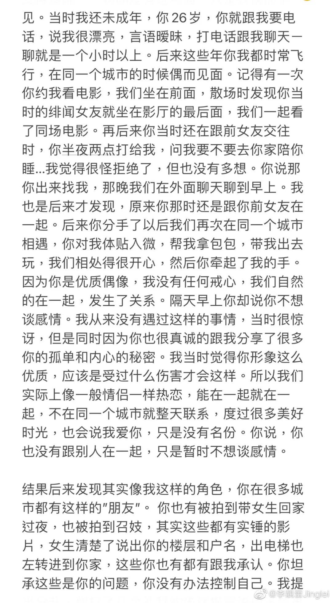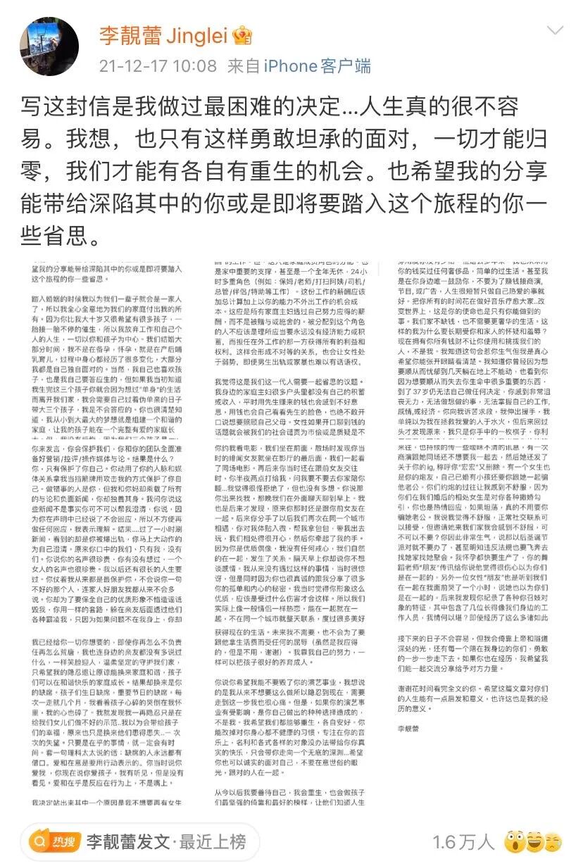 王力宏前妻李靓蕾在北京时间17日晚, 在社媒上发出“毁灭性长文”, 控诉自己多年在这段婚姻中的种种委屈!