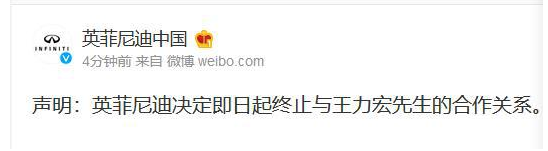 12月18日凌晨,英菲尼迪中国官微发布声明称,英菲尼迪决定即日起终止与王力宏先生的合作关系。