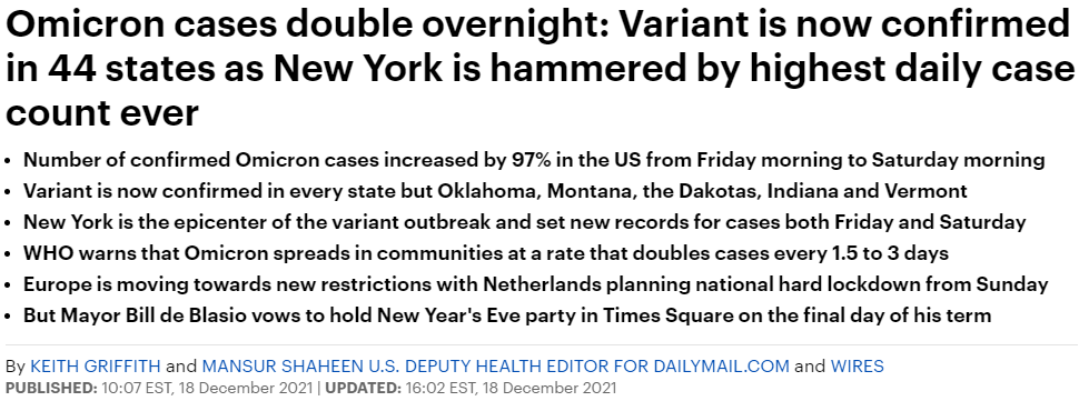 美国疾病控制与预防中心估计,Omicron 至少占纽约所有新病例的 13%,今天(12月18日,周六)记录的新 COVID-19 病例的单日最高记录为 21,908,打破了一天前创下的 21,027 的先前记录.