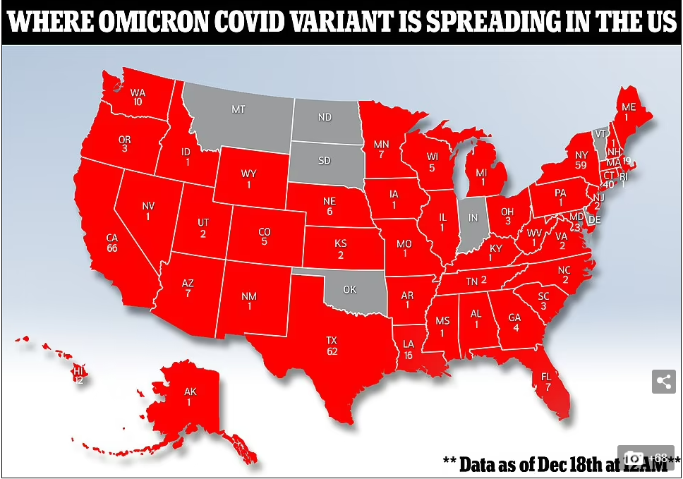 截至今天(12月18日,周六)上午,全美有 830 例经 DNA 测序确认的 Omicron COVID-19 变体病例,比昨天上午的统计数字增加了 97%。