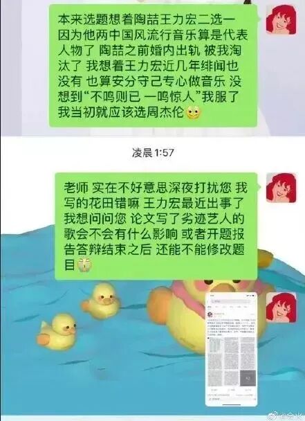不过就另一张聊天记录显示,该学生在大半夜传讯给指导教师,写道“老师实在不好意思深夜打扰您...王力宏最近出事了,我想问问您,论文写了劣迹艺人的歌会不会有什么影响,或者开题报告答辩结束之后,还能不能修改题目?”最后更附上一个“大哭”的表情符号。