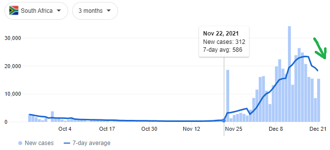 但进入本周后,南非的日新增病例数出现了明显的下降。昨天(12月21日)的新增病例数已下降到了15000多。