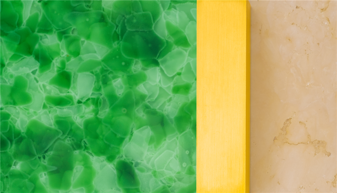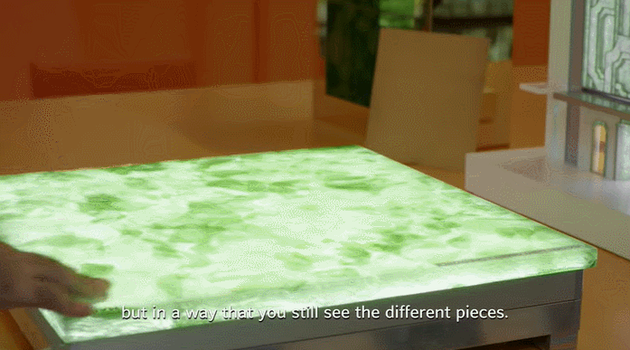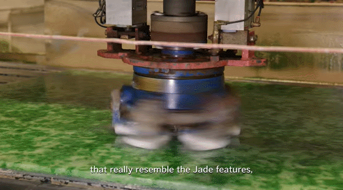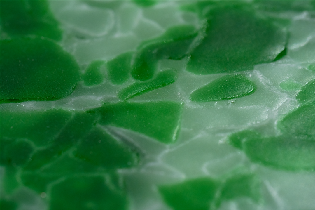 再通过热熔、压制、研磨,制成半透明质感的绿色花纹面板。