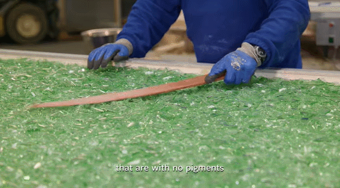 工厂经过删选、碾碎,将透明色与绿色玻璃渣相互叠加,营造宝石一般的视觉效果。
