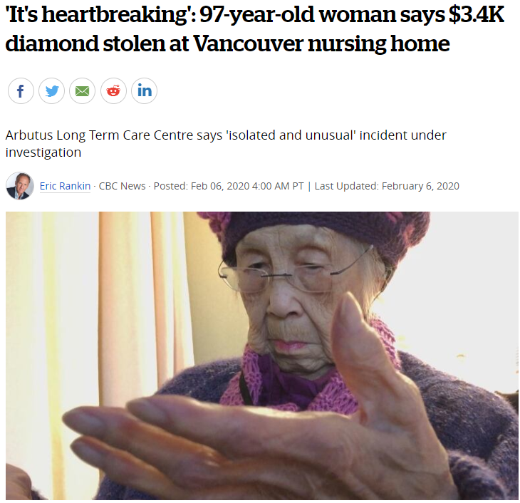 还记得去年,温哥华一名97岁的华裔女性黄女士(Mary Wong,译音),在养老院被人撬走了0.65克拉的钻戒,手上只留下空荡荡的戒环。