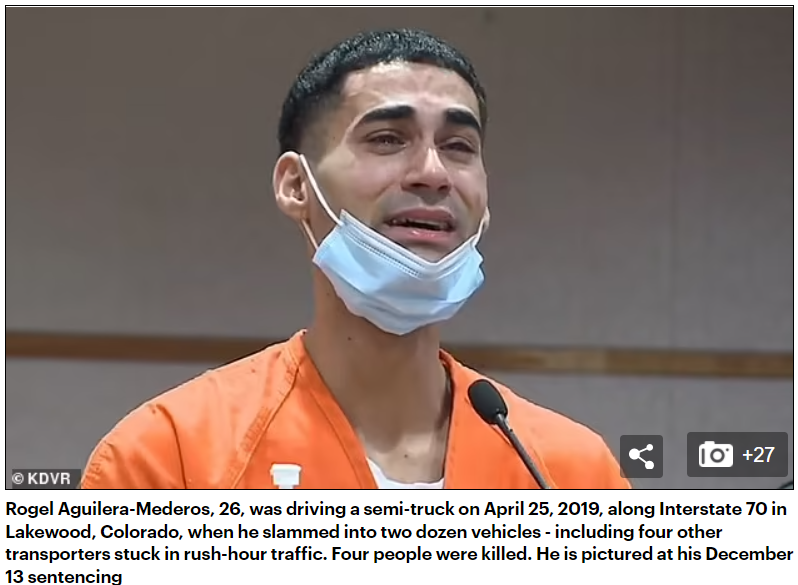 12 月 13 日,科罗拉多州法官判处一名卡车司机阿奎莱拉.梅德罗斯(Rogel Aguilera-Mederos)至少 110 年徒刑!