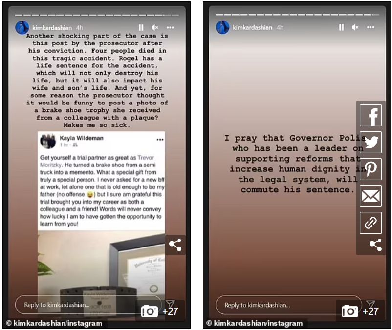 大明星金·卡戴珊 (Kim Kardashian)也为Rogel鸣不平,她在 Instagram 上向她的2.71 亿粉丝介绍了此案件。