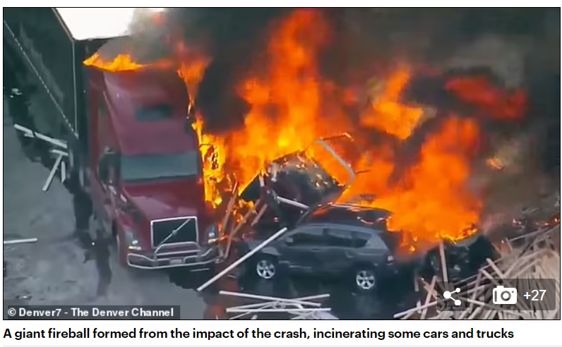 猛烈的撞击引起了巨大的火球爆炸,随着火势的蔓延以及滚滚的浓烟,汽车里被迫在各个方向四散停下来,多辆汽车和卡车被烧毁。 最终,四人死亡,六人被送往医院。