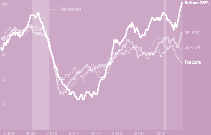 紧张的劳动力市场令人兴奋地带来了工资上涨。全球金融危机爆发后的几年里,薪酬停滞不前是一个令人沮丧的特征。随着危机的缓解和失业率的下降,工资增长的幅度开始恢复,尤其是对那些不太富裕的美国人来说。增长的部分原因是一些州提高了最低工资,以及许多与新冠相关的联邦刺激计划帮助推动工资增长率达到了自21世纪初以来的最高水平。归功于这些计划,底层25%的工人的工资增长最快。
