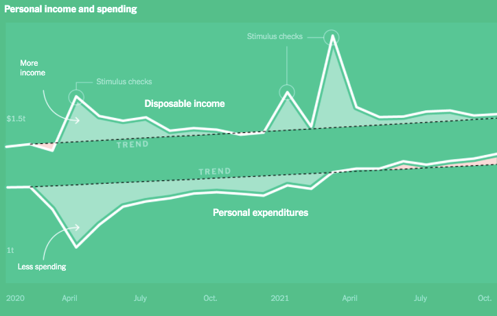 为什么会有这么高的通胀?基本上就是供求关系。美国人一直坐拥超过2万亿美元的“超额储蓄”——他们持有的钱高于正常水平。政府的一系列计划——刺激性支票、失业金、税收减免等占了其中一半的原因,另一半是因为大流行第一年的支出异常低。但随着封锁的放松,美国人开始消费,其速度快于历史趋势。