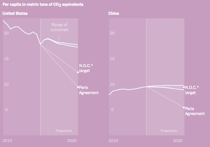 美国和中国以吨计算的人均二氧化碳水平 I 资料来源:气候行动追踪(排放);联合国世界人口展望(历史人口和预测人口)