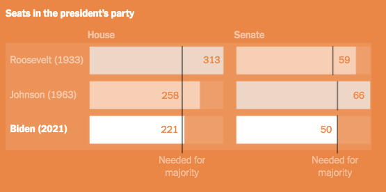 第73届、88届和117届总统在国会享有的席位。截至2021年12月,拜登在众议院的差额是在A. Hastings(D.-Fl.)于4月去世后;拜登在参议院的优势包括两位独立人士,A. King(Me.)和B. Sanders(Vt.),他们与民主党人一起参加党团会议。如果参议院的票数为50比50,副总统将投出决胜局的一票。I 来源:美国众议院;美国参议院