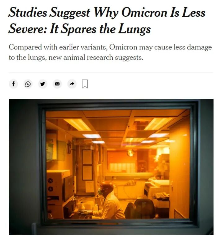 12月29日,美国和日本的科学家们发现,对老鼠和仓鼠的多项研究表明,奥密克戎造成的感染伤害性小得多,往往主要局限于上呼吸道:鼻子、喉咙和呼吸道;而且对肺部的伤害要小得多。