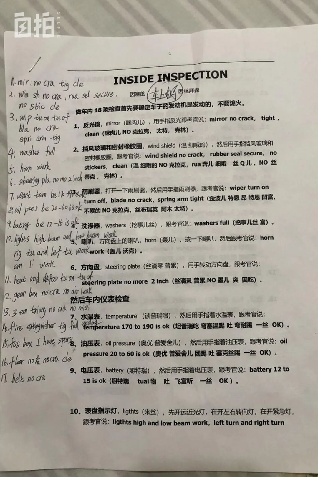对英文不好的小白夫妻来说,最头疼的就是背“车检”,就是车子启动前要检查车,比如打开车头看看发动机,对考官说发动机很好,很干净,没有损坏的螺丝,还要检查管子、冷却液,轮胎等等。