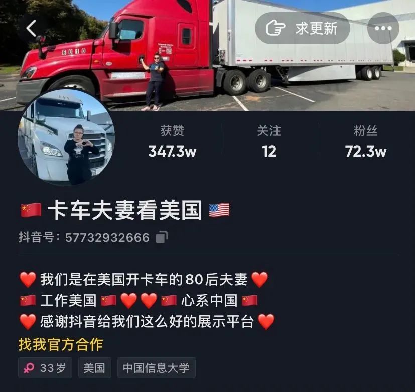 最近,一则“东北夫妻在美国开卡车月入10万元”在抖音火了,博主是80后的东北夫妻,俩人在美国一起开卡车,月入10万元人民币(约1.57万美金)以上,令人羡慕不已。