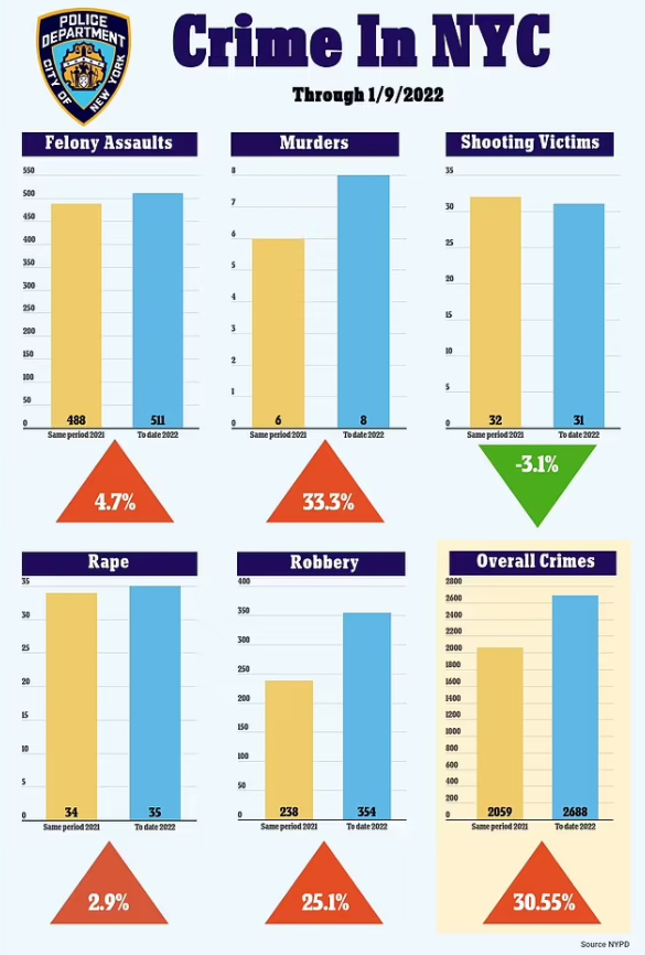 与去年同期相比,纽约市的重罪袭击数量增加了4.7%,总犯罪率增加了30.5%,就时报广场地铁站所在的区域,从1月 1 日至1月9日,仅仅发生了17起重罪袭击事件,与去年相比增加了 325%。