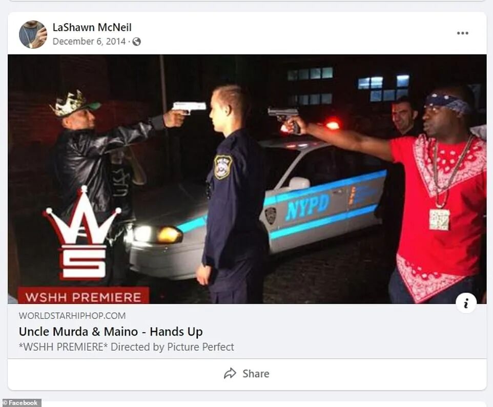 描述了警察对黑人男子施暴的画面,两名说唱歌手出现时用枪指着一名坚毅的白人警官的头,他们唱道:"是时候开始杀死这些警察了。