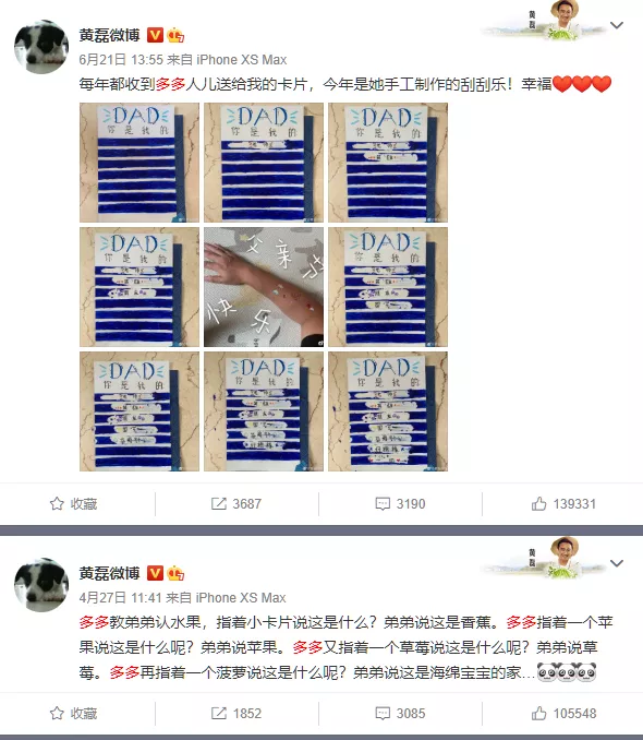 “多多”、“妹妹”、“弟弟”,他的微博,像极了孩子们的“成长日记”,一字一句都是“老父亲”陪伴孩子成长的点点滴滴,喃喃细语,真切温暖。 心理学家戴维·埃尔金德说过:“在爱中成长起来的孩子,他们被足够的爱滋养,生活会更从容淡定。”