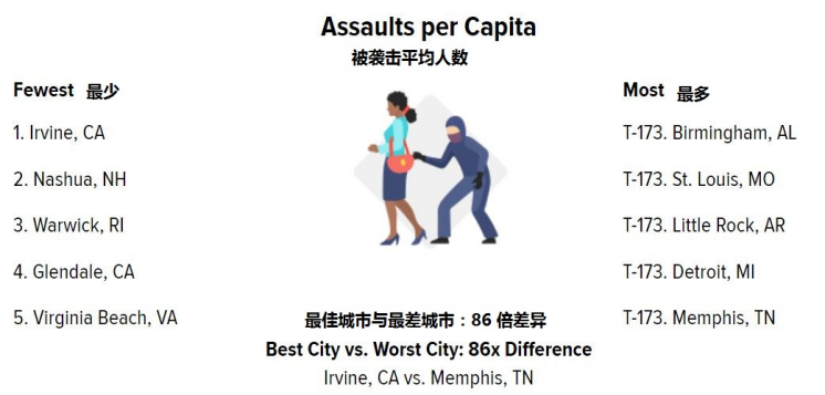 近日,美国信用评分网站WalletHub发布了最新《美国最安全的城市排名》。 该网站研究评估了182个主要城市的42项安全指标,最终发布了一个100分制的分级量表。 其中安全指标包括当地的犯罪率、自然灾害、新冠疫苗接种率和失业率等,以衡量三个关键特征的安全:家庭和社区安全、自然灾害风险和财产安全。 根据美国信用网站WalletHub网站发布的最新数据,马里兰州哥伦比亚市(Columbia,Maryland)被评为美国“最安全”的城市。 而密苏里州的圣路易斯市( St. Louis, Missouri)则被评为美国“最危险”的城市。 这项研究是在公共安全、法律和秩序仍然是11月中期选举选民的首要问题之际而进行的,对犯罪政策的松懈和要求解除警察的呼吁,很可能会影响到一些犯罪猖獗城市的民主党人。 研究人员在一份声明中表示,“美国的安全威胁来自于多个方面,从新冠疫情的持续存在到自然环境灾害,再到大规模枪击案件和交通事故。一些城市真的很擅长于保护居民免受伤害。” 美国最安全城市排名前十如下: 第一名:哥伦比亚市——马里兰州 第二名:纳舒尔——新罕布什州 第三名:拉雷多——德克萨斯州 第四名:波特兰——缅因州 第五名:沃里克——罗德岛州 第六名:杨克斯——纽约州 第七名:吉尔伯特——亚利桑那州 第八名:伯灵顿——佛蒙特州 第九名:罗利——北卡罗来纳州 第十名:路易斯顿——缅因州 马里兰州哥伦比亚市(Columbia, Maryland)被评为美国最安全的城市,全市人口约为10万人,距华盛顿特区约31英里,在生活质量、就业机会和治安方面,得分都较高,是一个非常适合居住的城市。 美国最危险城市排名如下: 第一名:圣路易斯——密苏里州 第二名:劳德代尔堡——佛罗里达州 第三名:圣贝纳迪诺——加州 第四名:底特律——密西根州 第五名:巴吞鲁尔——路易斯安那州 第六名:孟菲斯——田纳西州 第七名:俄克拉何马——俄克拉何马州 第八名:奥克兰——加州 第九名:杰克逊——密西西比 第十名:查塔努加——田纳西州 排名最末位的城市是密苏里州的圣路易斯(St. Louis, Missouri),尽管这座城市约有这30万的人口,在某种意义上被评为充满活力的城市,但这里相对较高的暴力犯罪、种族歧视和其他问题导致综合评分最低。 WalletHub发布美国最安全城市排行榜(共182个城市): 纽约市:第127 康州纽黑文:第67 纽瓦克:第90 新泽西市:第87