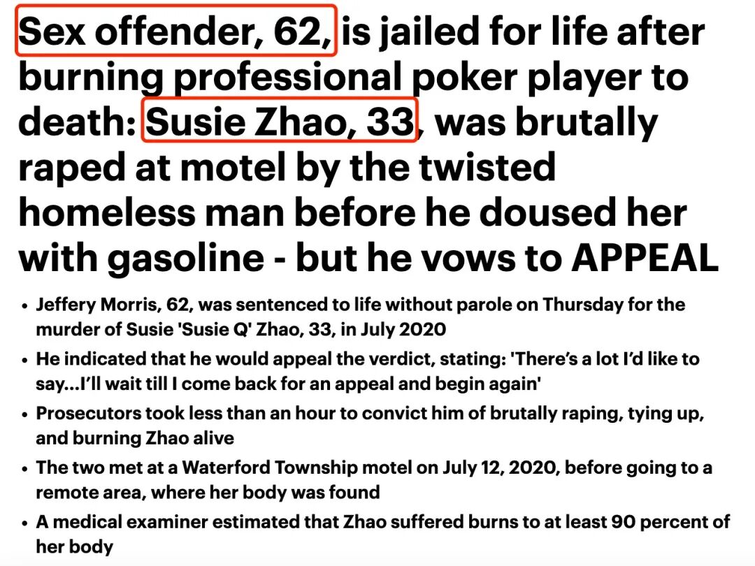 警方调查后才发现, 这是一具生前遭受残忍性侵的华裔女性尸体, 到底什么恩怨,让一个年轻的女孩儿如此悲惨地死去, 近期这起案件的审判终于到来,细节曝光,极其骇人! 通过警方的深入检查, 发现这具不成人样的尸体, 竟然是年仅33岁的华人女性Susie Zhao, 她是扑克圈内小有名气的华人职业选手, 事件曝光后,整个美国华人圈都轰动了。