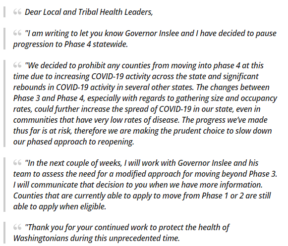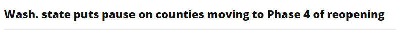 由于最近华州新冠病例数不断增加,华州卫生部和州长今天共同宣布,暂停各县进入复工第4阶段的申请。在这个消息官宣之前,华州已经有8个县有资格从第3阶段进入第4阶段。