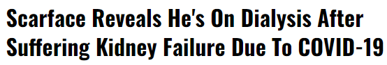 美国著名歌手Scarface新冠肺炎症状均已消失,但因新冠肺炎导致肾衰竭,正接受透析治疗,肾脏损伤的恢复恐怕遥遥无期。