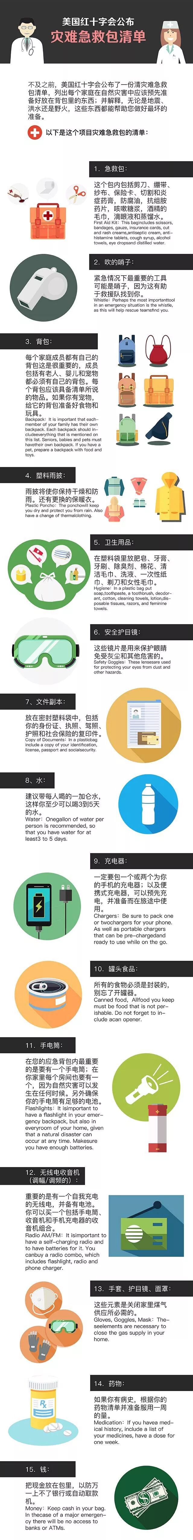 应急包 准备清单: 1.简单的换洗衣服和太空毯 2.现金、ID(护照)、钥匙、备用眼镜 3.防毒面具、口罩、免洗消毒液、日用品、纸巾 4.自我防卫物品、紧急医疗用品、常用药及正在服用的处方药和特殊必备药品,如哮喘喷雾 5.电池、应急灯、常用充电器、瑞士军刀等小工具 6.饮用水和干粮,如有宠物,不要忘记宠物的口粮