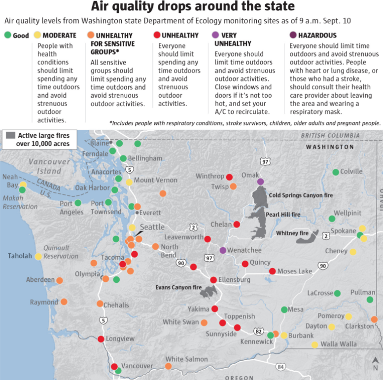 华盛顿州野火影响,被浓烟笼罩,火灾风险上升,空气质量水平则直线下降。干燥的空气覆盖了华盛顿州的大部分地区,这里几乎变成了一个火药桶。
