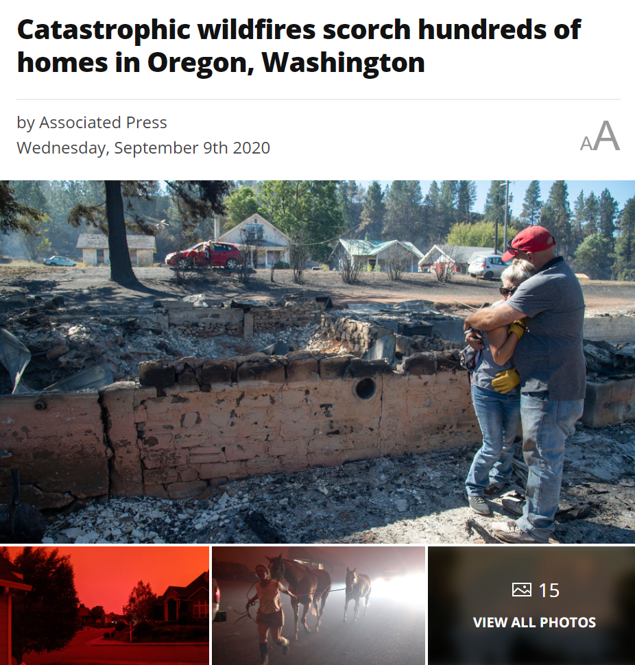 目前俄勒冈州山火烧毁面积已经超过800,000英亩的土地,而且还在扩大。