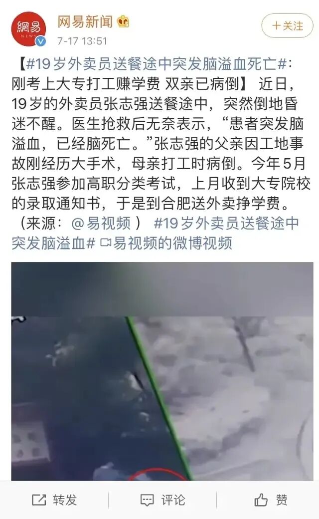结果在送餐途中,突发脑溢血身亡。