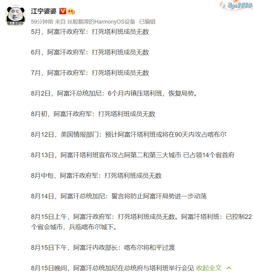 阿富汗民族和解高级委员会主席阿卜杜拉在社交网站发布视频,证实阿富汗总统加尼已经离开阿富汗。