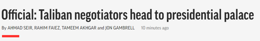 美联社8月15日援引一名阿富汗匿名官员的话称,阿富汗塔利班的谈判代表正前往阿富汗总统府,为“权力移交”做准备。CNN援引消息人士的话称,有八、九名来自卡塔尔的塔利班代表进入了阿富汗总统府,其中包括塔利班副领导人西拉柱丁·哈卡尼(Sirajuddin Haqqani)的兄弟阿纳斯·哈卡尼(Anas Haqqani)。