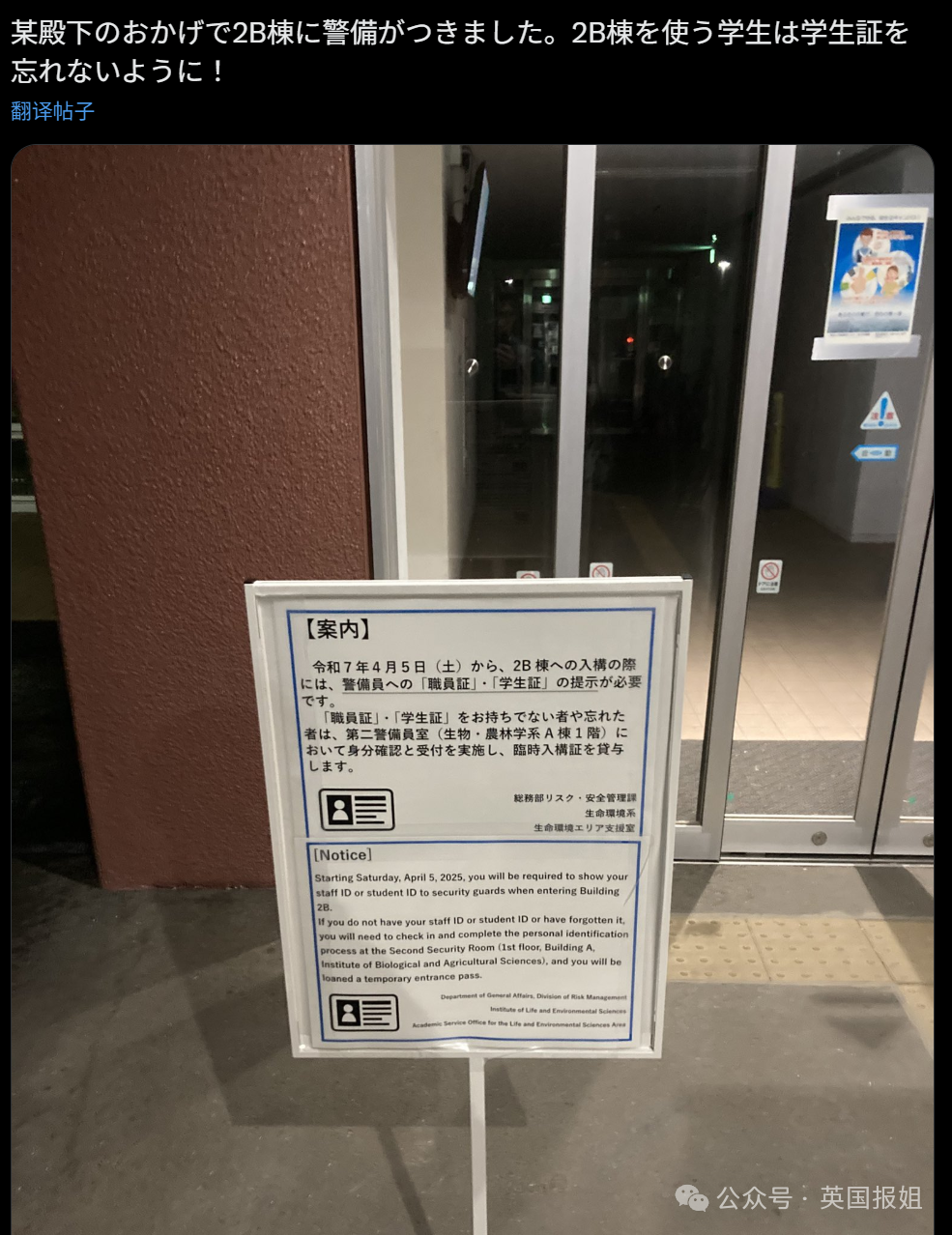 悠仁一过来,大学首先不能忽视的就是安保问题。悠仁经常出入的学校建筑物门口加了警卫,出入要出示身份证明,一些学生会觉得有种被监视的感觉。