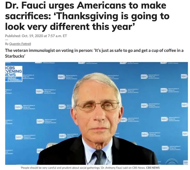 福奇说:“我也很想和我的孩子们在一起,他们也很想我们,尤其在这个非常时期。但他们在三个不同的州生活,不得不坐飞机才能来和我们团聚。这个节日季,让我们为此做出一些牺牲,不要聚会了。”