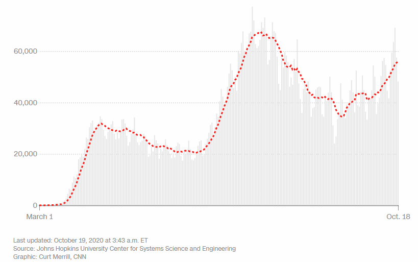 在入院治疗人数增加之前,美国的疫情经历了几周平静期,总体来说感染人数在下降。但在过去的7天里,疫情有所抬头,据约翰霍普金斯大学(Johns Hopkins University)数据的分析,过去七天,美国平均每天报告约有5.6万例新发病例,较一周前增加了超过13%。远高于9月初的每天确诊约3万病例。